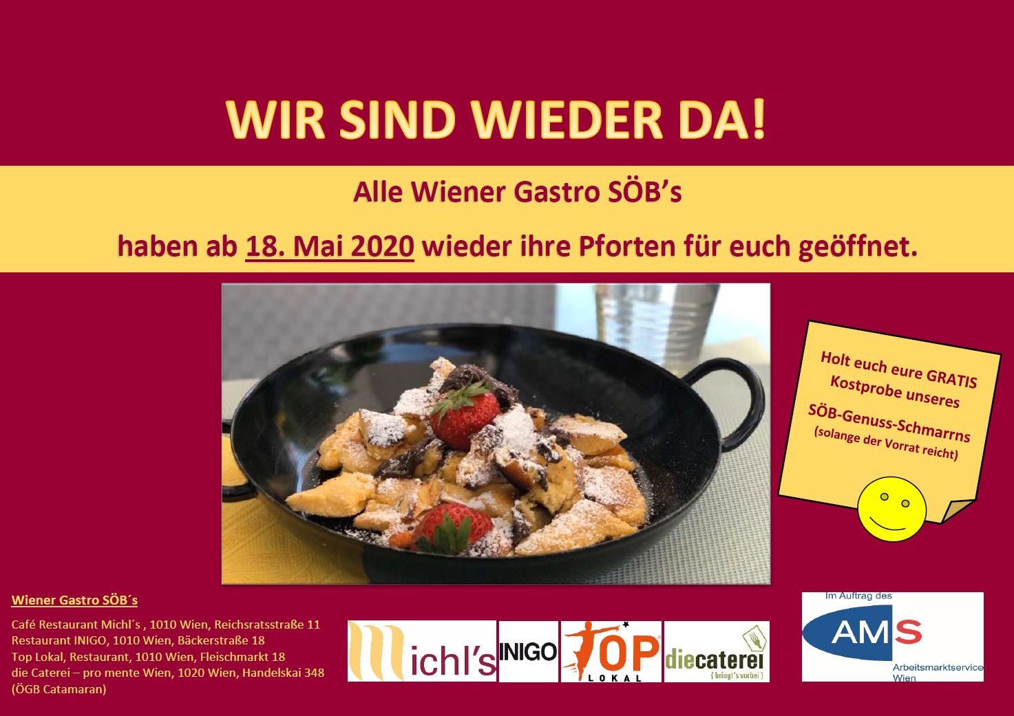 Alle Wiener Gastro SÖB´s haben ab 18. Mai 2020 wieder ihre Pforten für euch geöffnet. Zusätzlich bieten wir unseren “SÖB-Genuss-Schmarrn” als besonderes Schmankerl in Form einer kleinen Kostprobe für euch an.