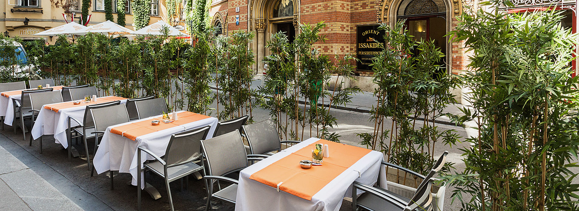 Kommen Sie ab 08:00 vorbei und genießen Sie ein Frühstück, Mittagsmenü oder Wiener + internationale Spezialitäten á la carte in unserem Schanigarten mitten im 1. Bezirk.