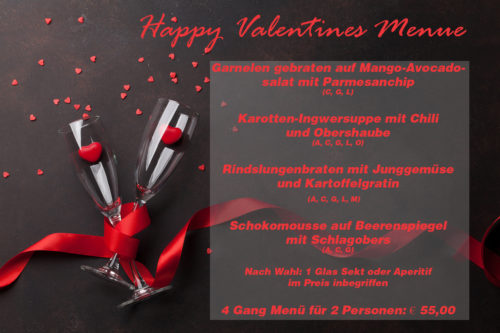 Du willst ein romantisches Valentines Dinner mit deinem Schatz verbringen? Dann komm von 10.02.-14.02 im TOP Lokal vorbei! Um telefonische Reservierung wird gebeten (01/5130203). Zum aktuellen Menü
